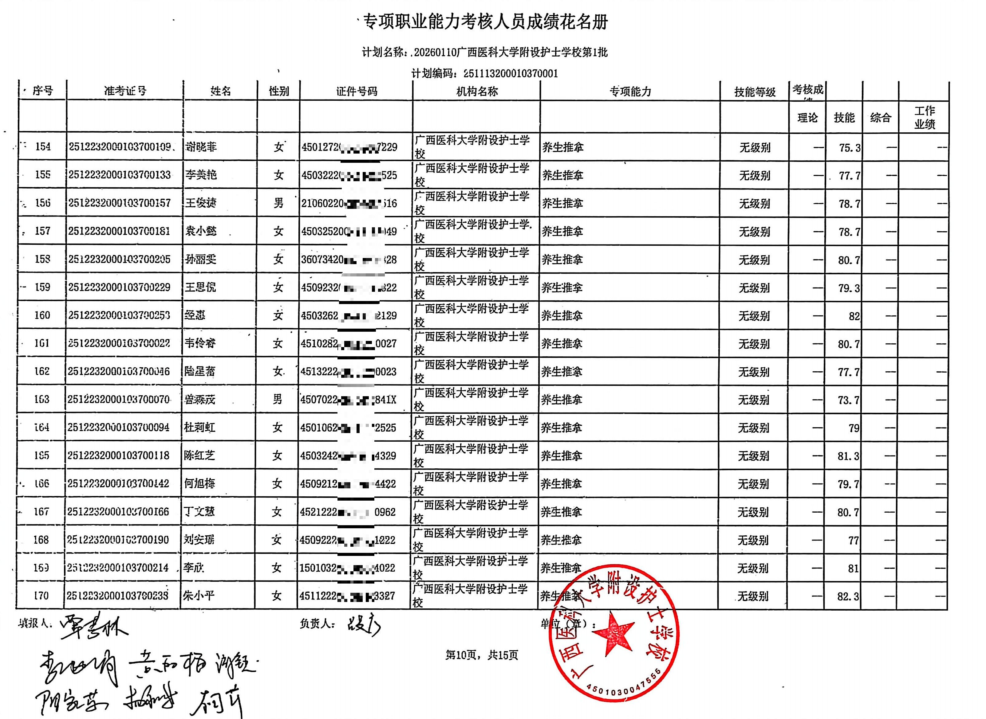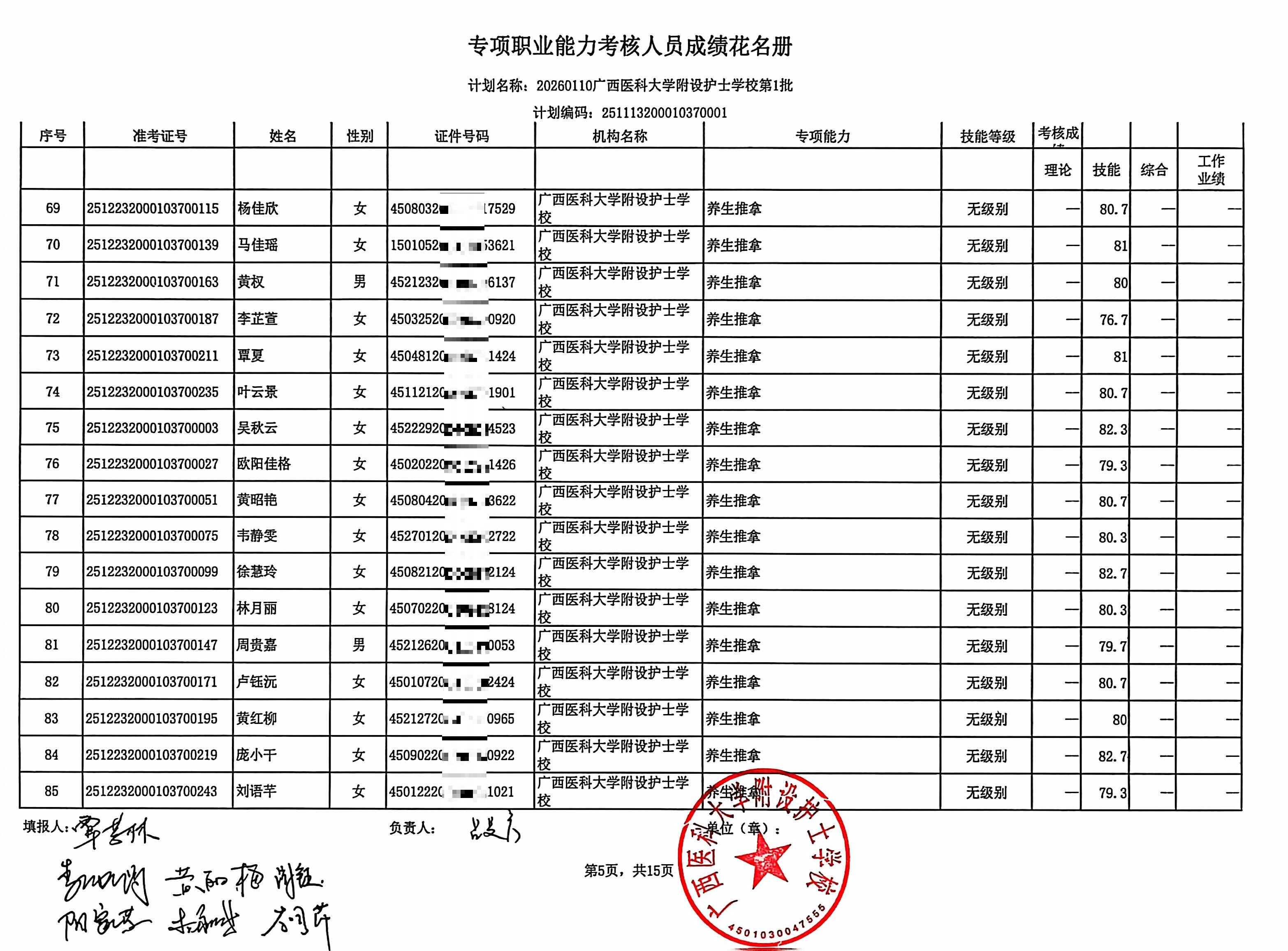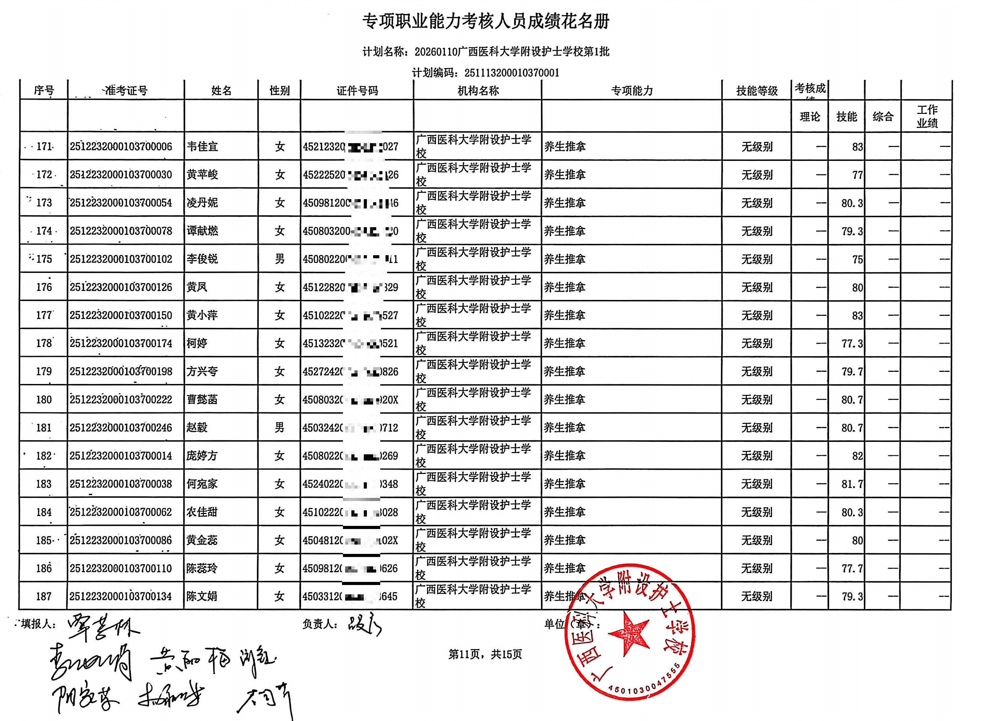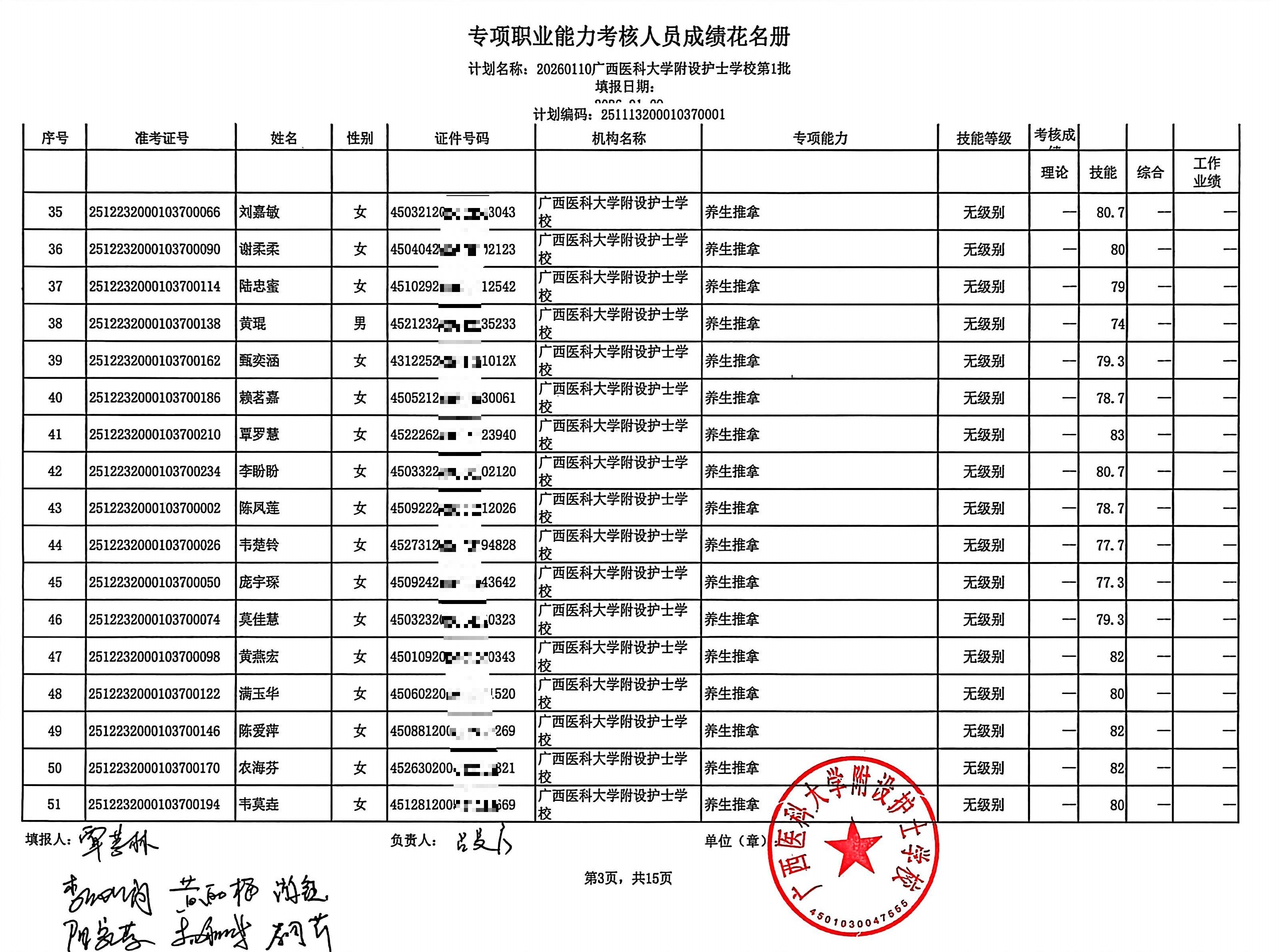 2026年1月养生推拿、小儿推拿(在校生) 专项能力认定考生成绩公示