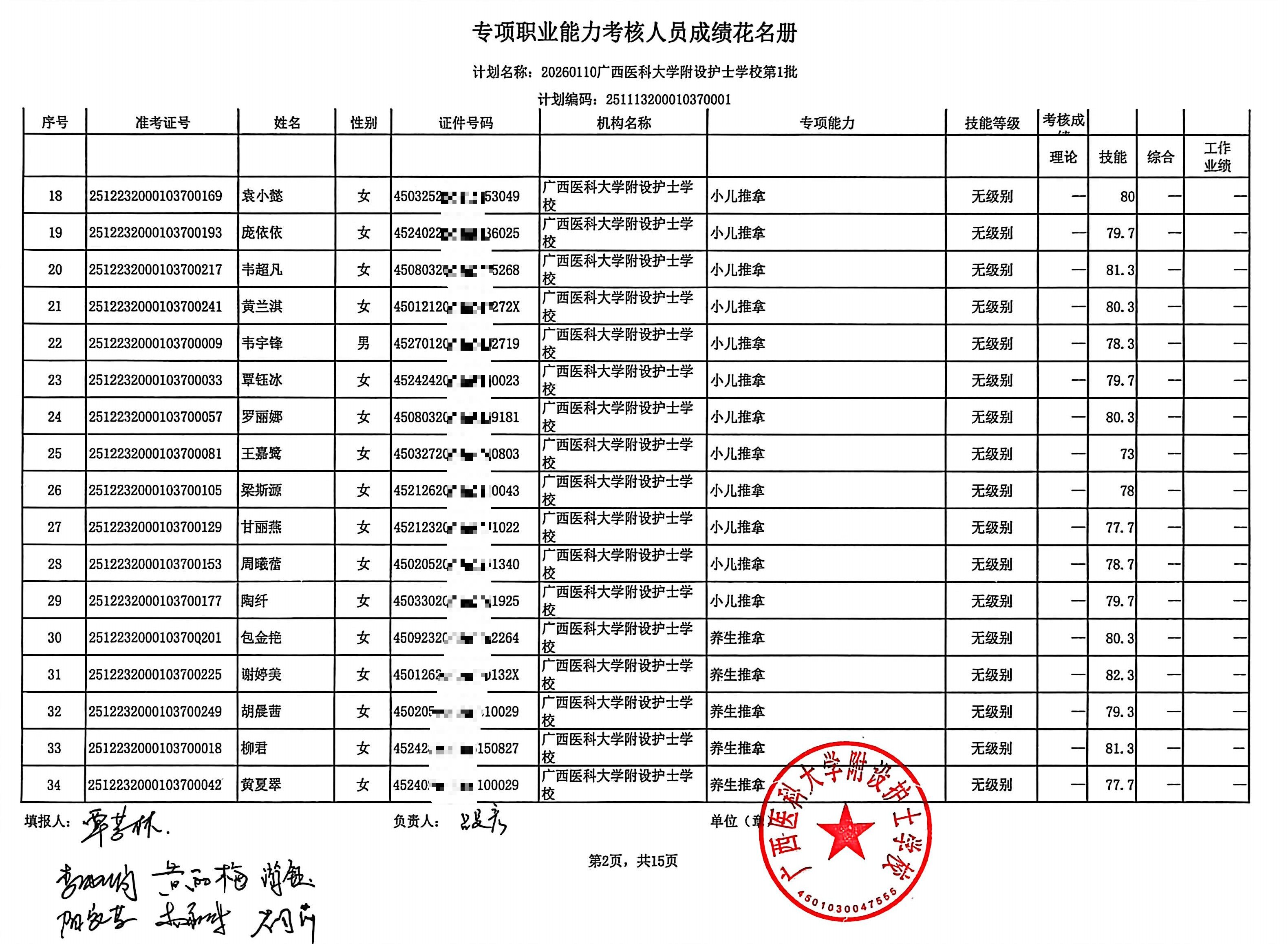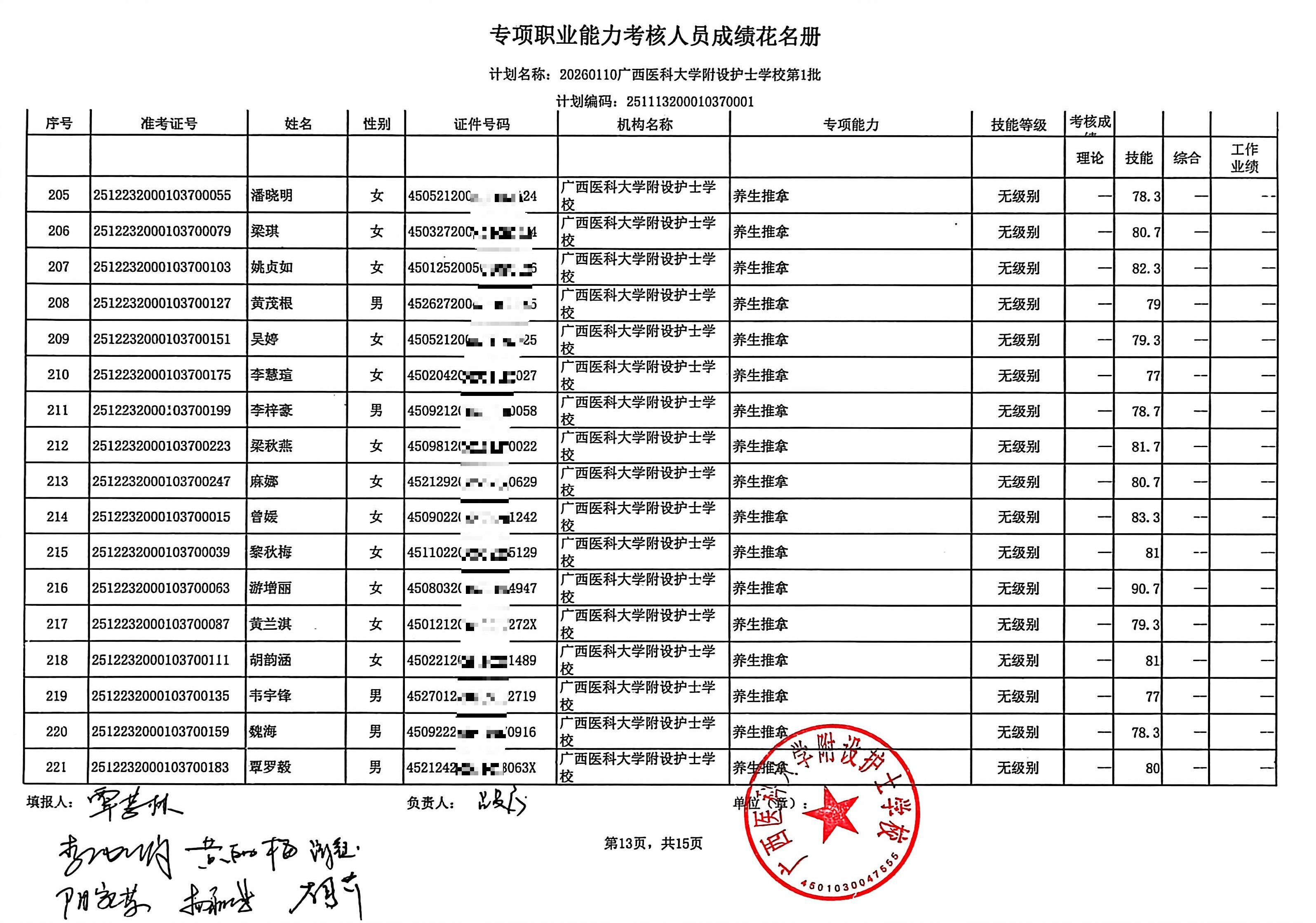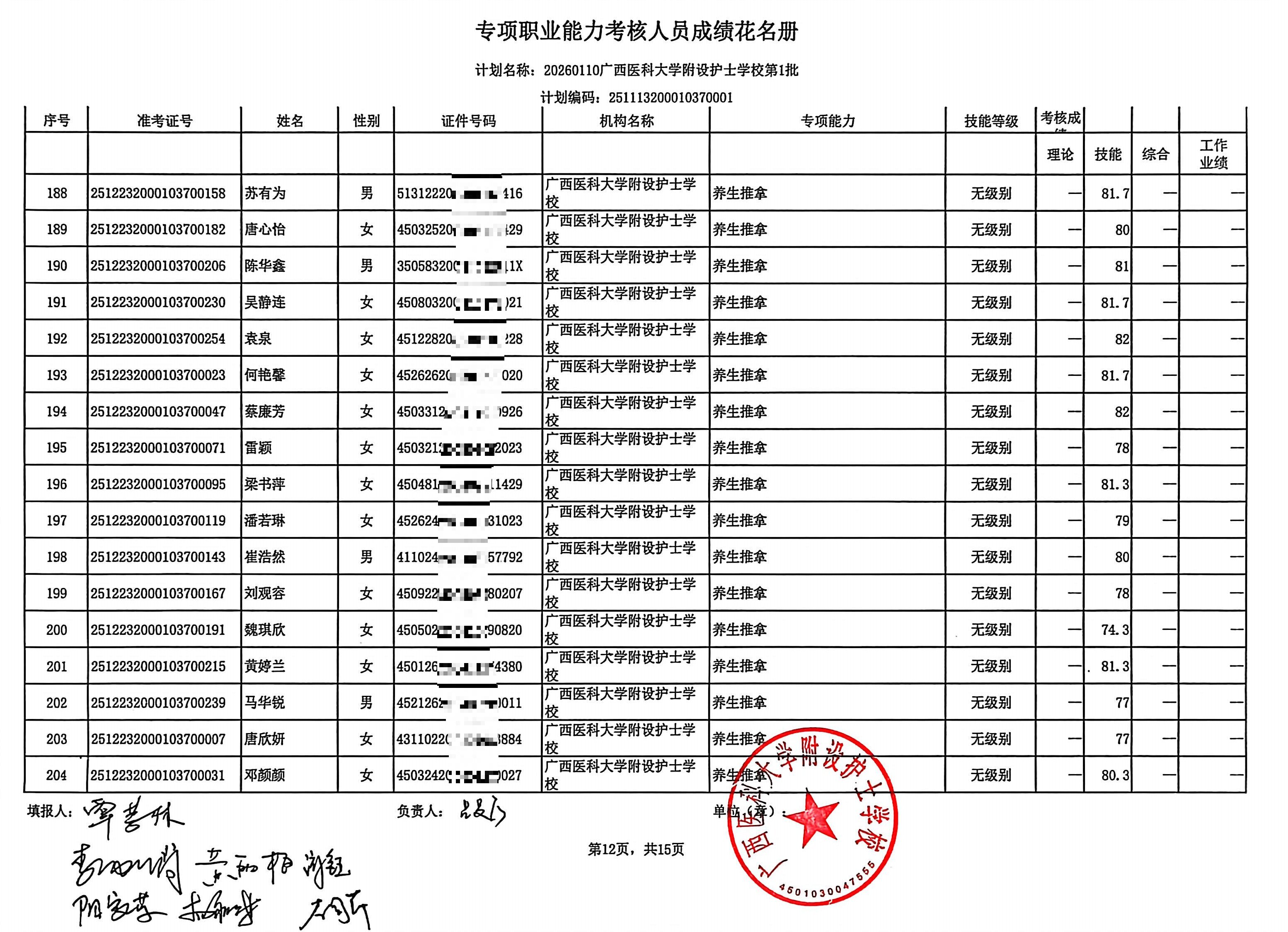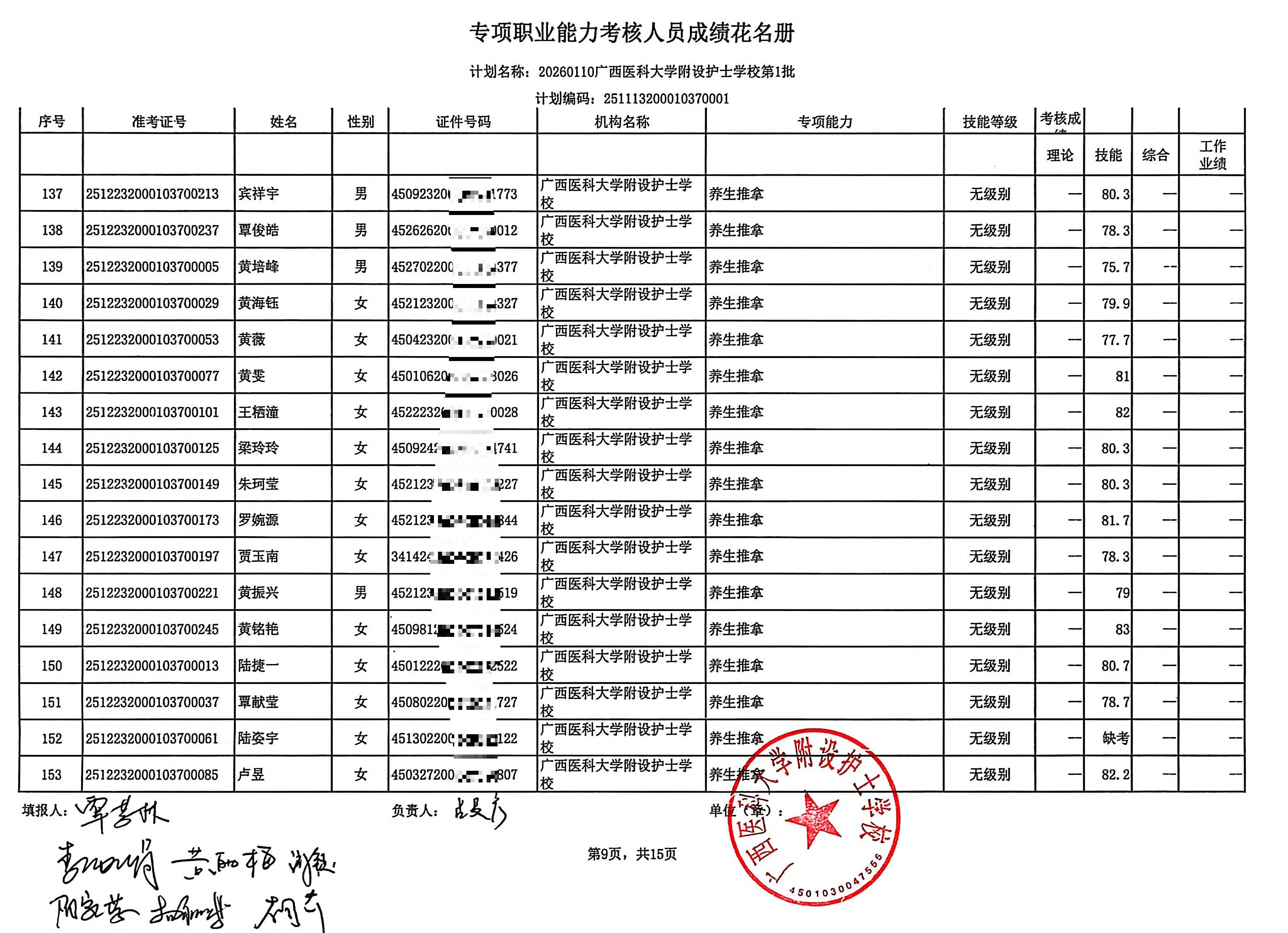 2026年1月养生推拿、小儿推拿(在校生) 专项能力认定考生成绩公示