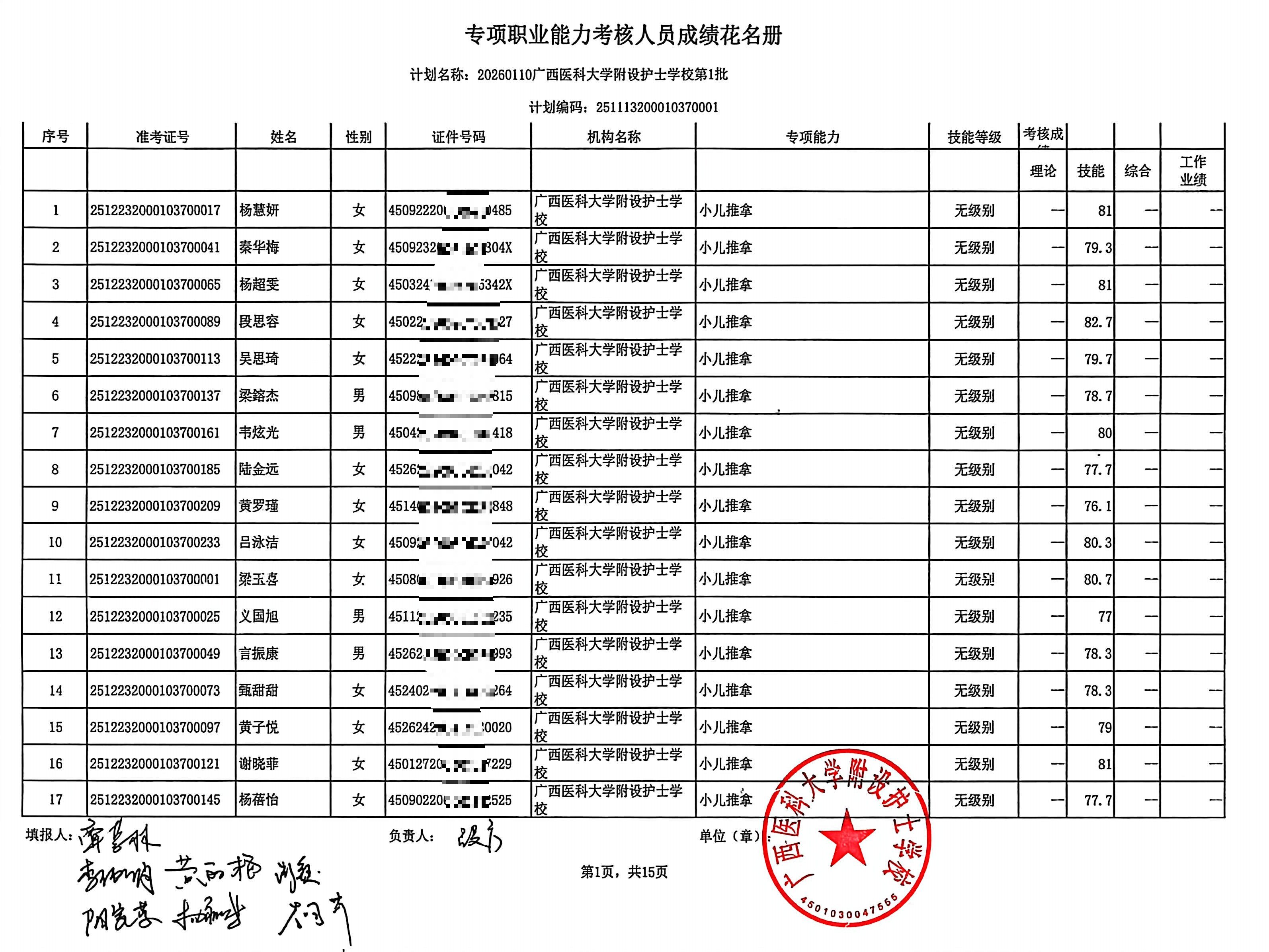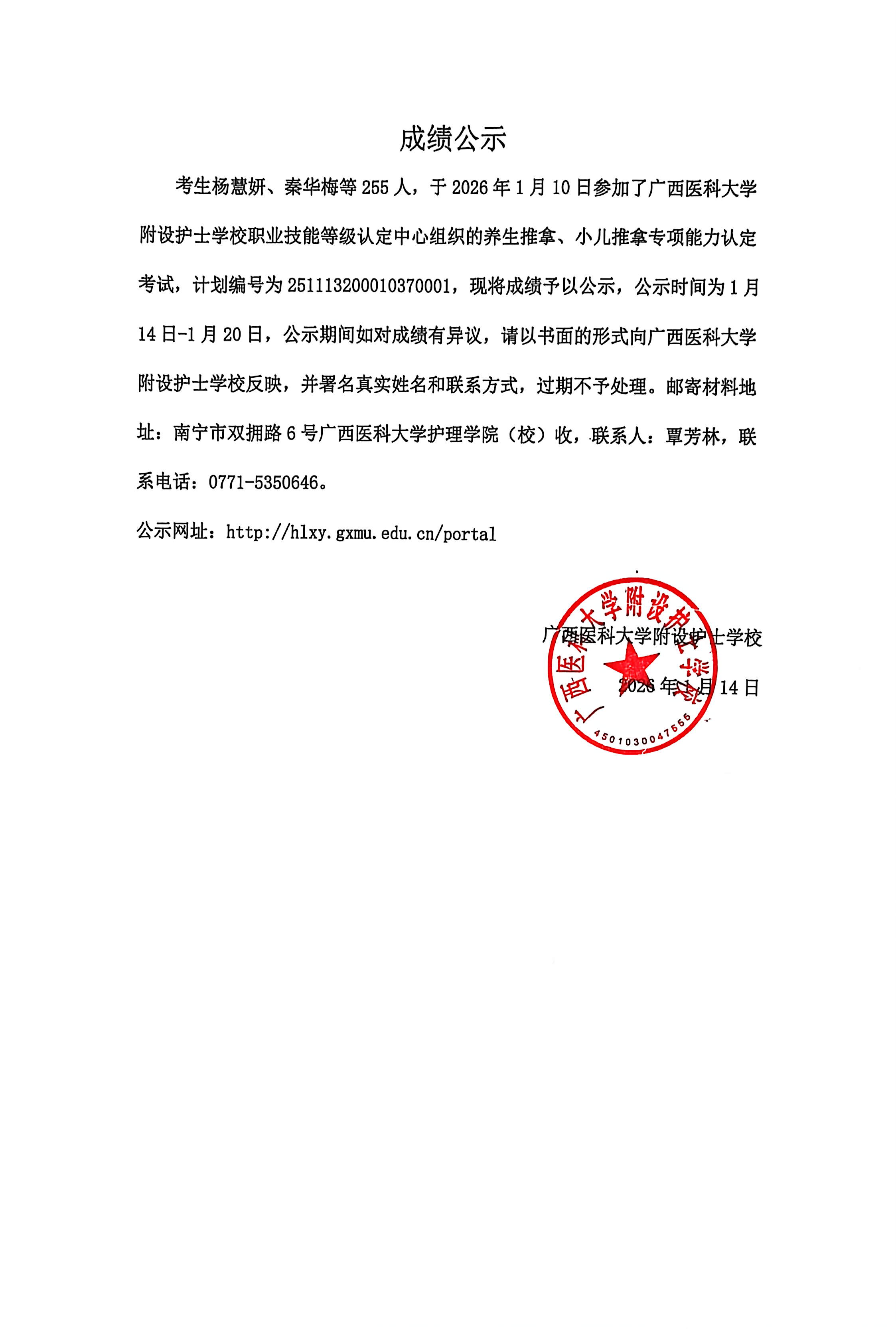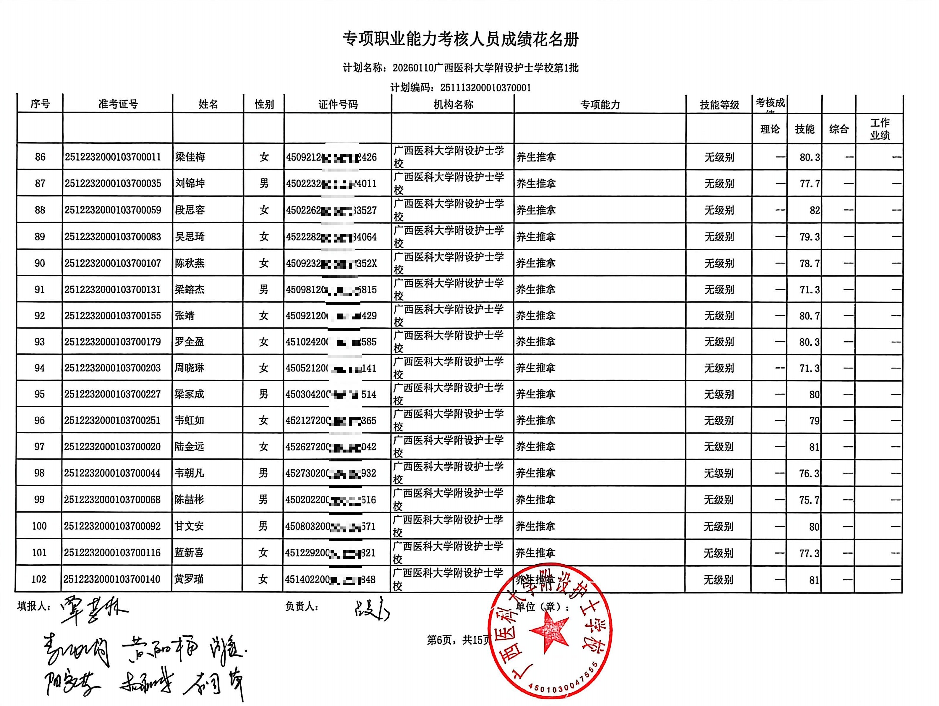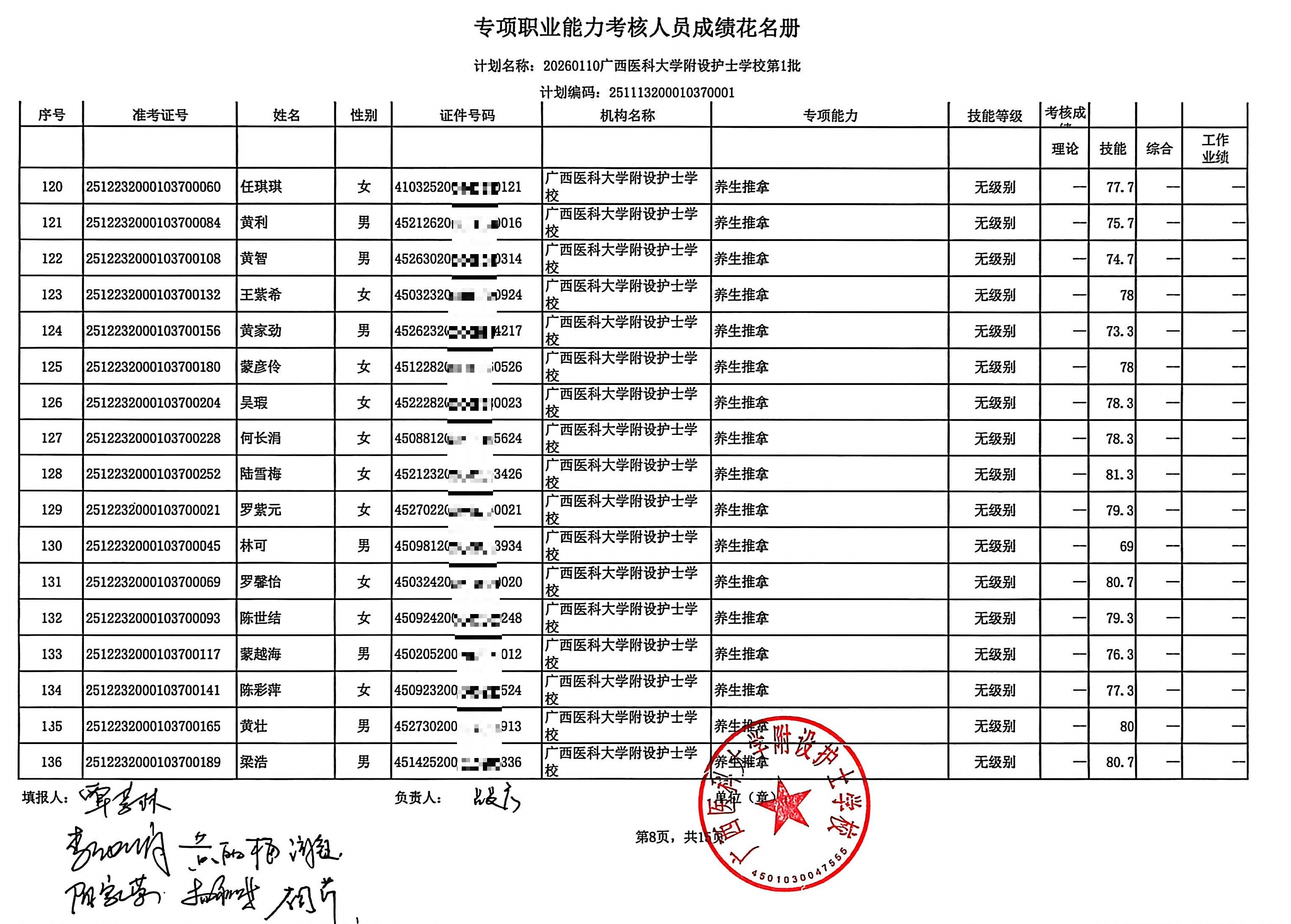 2026年1月养生推拿、小儿推拿(在校生) 专项能力认定考生成绩公示